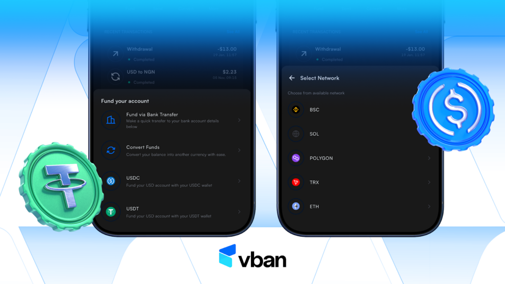 With this feature, Vban users can receive funds globally through supported blockchain networks, including Tron (TRC20), Ethereum, Polygon, Solana, and Binance Smart Chain (BEP20).